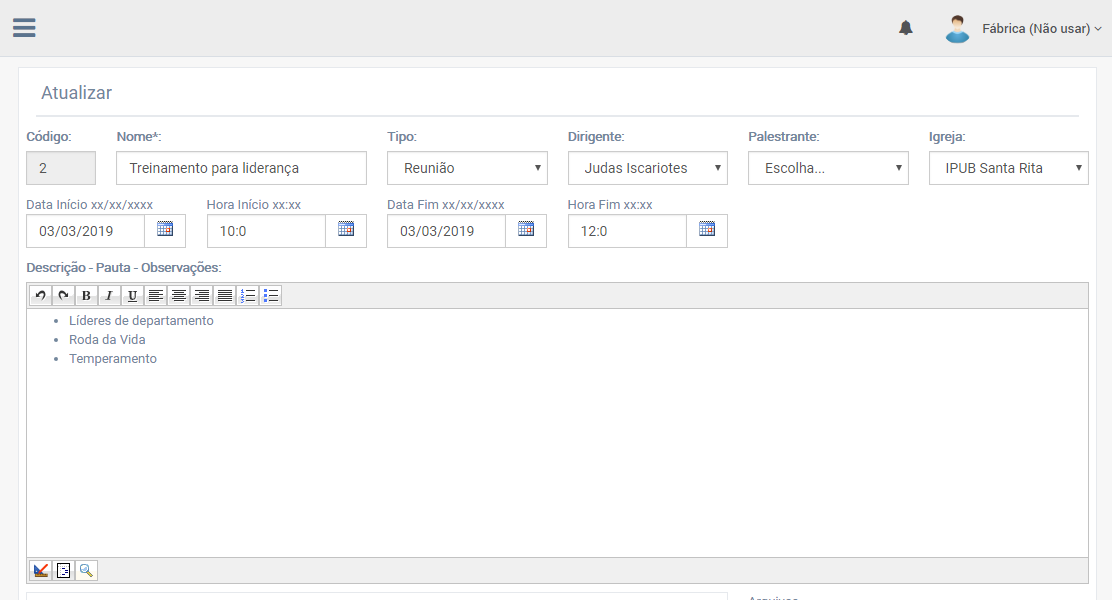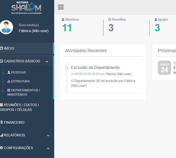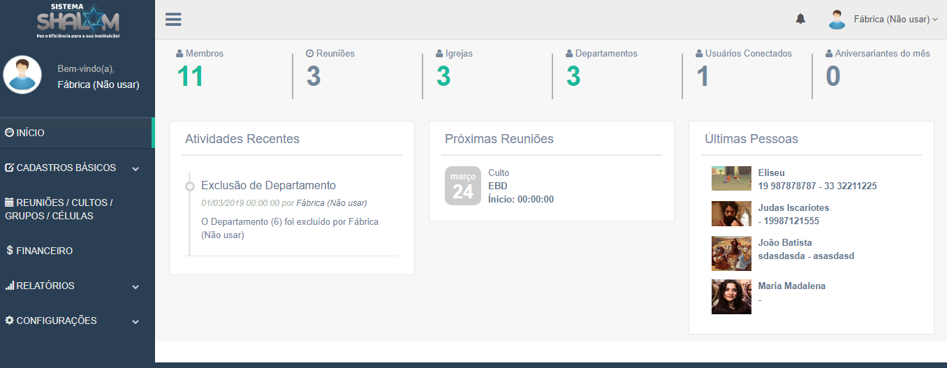 Tenha o controle da organização dos cultos e reuniões, da frequência dos participantes, histórico dos pregadores.